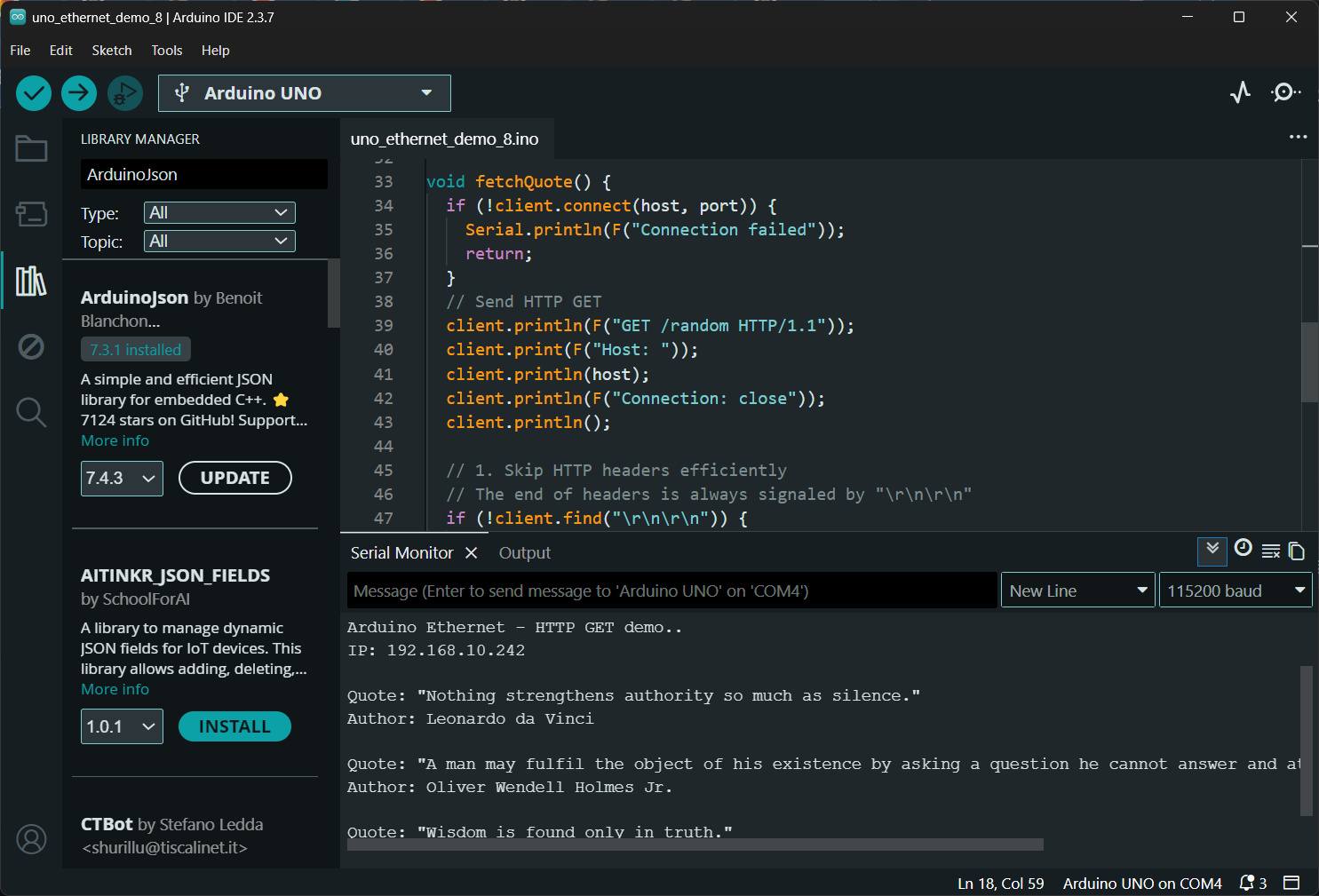 นอกจากนี้ยังมีตัวอย่างการติดต่อกับ DNS Server เพื่อแปลงชื่อ Host Name ให้เป็น IP Address รวมถึงการส่ง HTTP Request แบบ GET Method ไปยัง Web Server ที่ตอบกลับข้อมูลในรูปแบบ JSON
