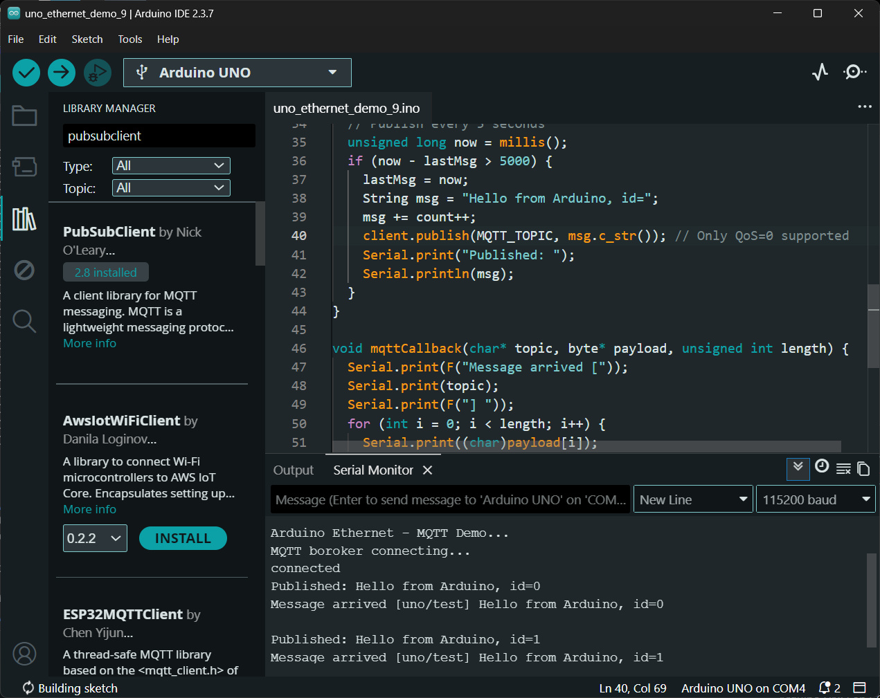 โดยอาศัยไลบรารี PubSubClient ซึ่งเป็นไลบรารีที่นิยมใช้มาก แต่ก็มีข้อจำกัด เช่น