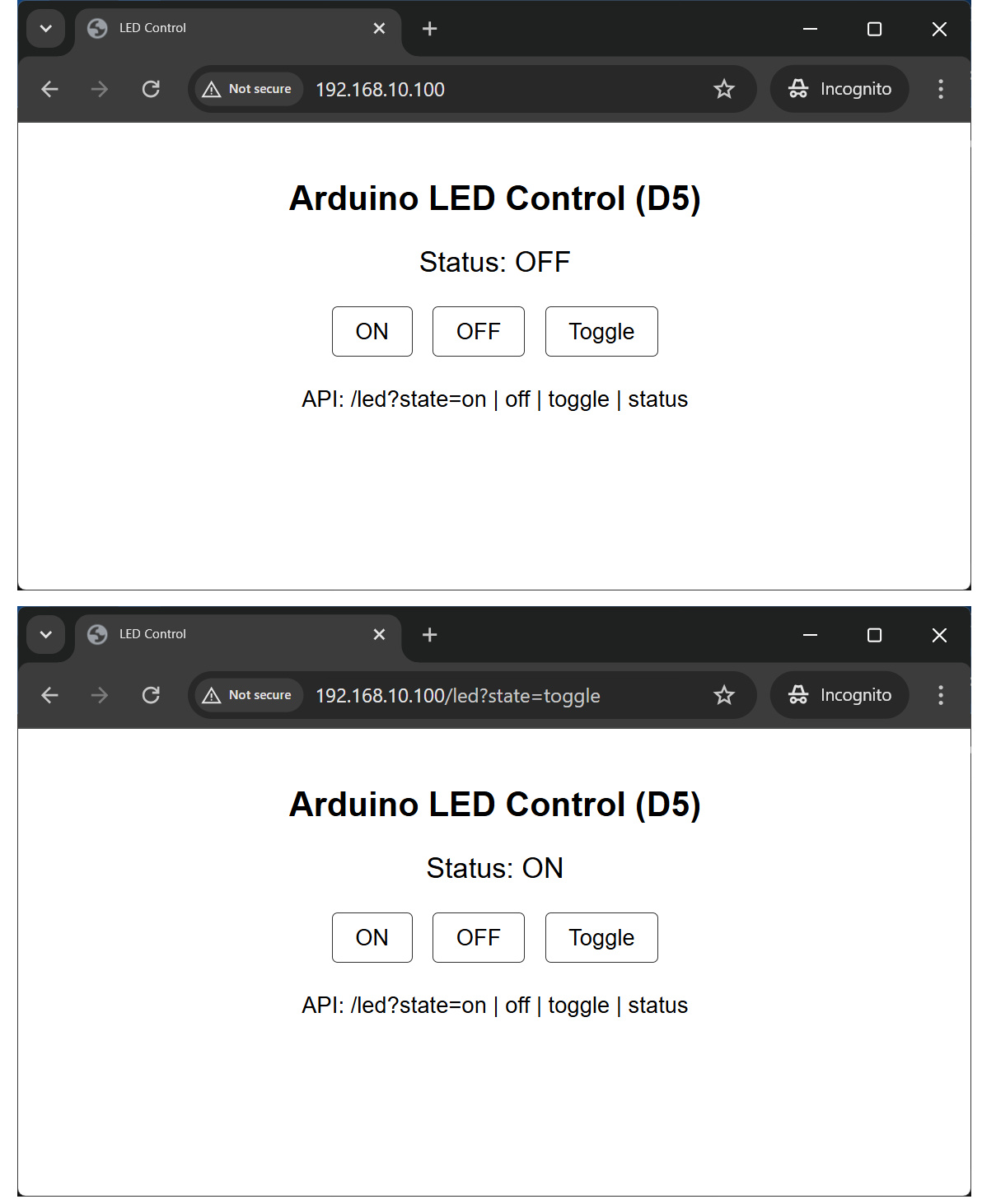 else if (strncmp(p, "toggle", 6) == 0) { ledOn = !ledOn; }