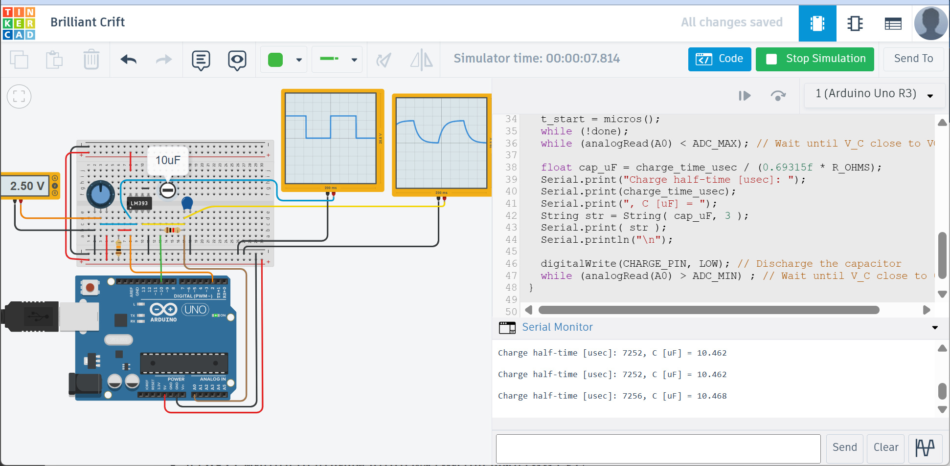 - ตรวจวัดสัญญาณแอนะล็อกที่ขา A0 ของบอร์ด Arduino เพื่อสังเกตรูปคลื่นแรงดันไฟฟ้าบนตัวเก็บประจุ ()
