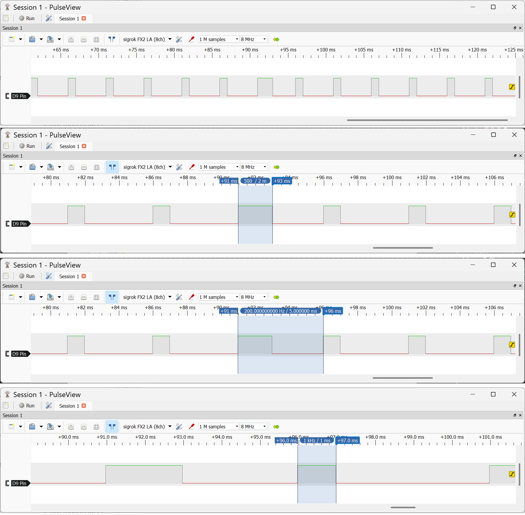 รูป: ตัวอย่างการวัดสัญญาณเอาต์พุตจากบอร์ด Arduino Uno โดยใช้ USB Logic Analyzer + PulseView