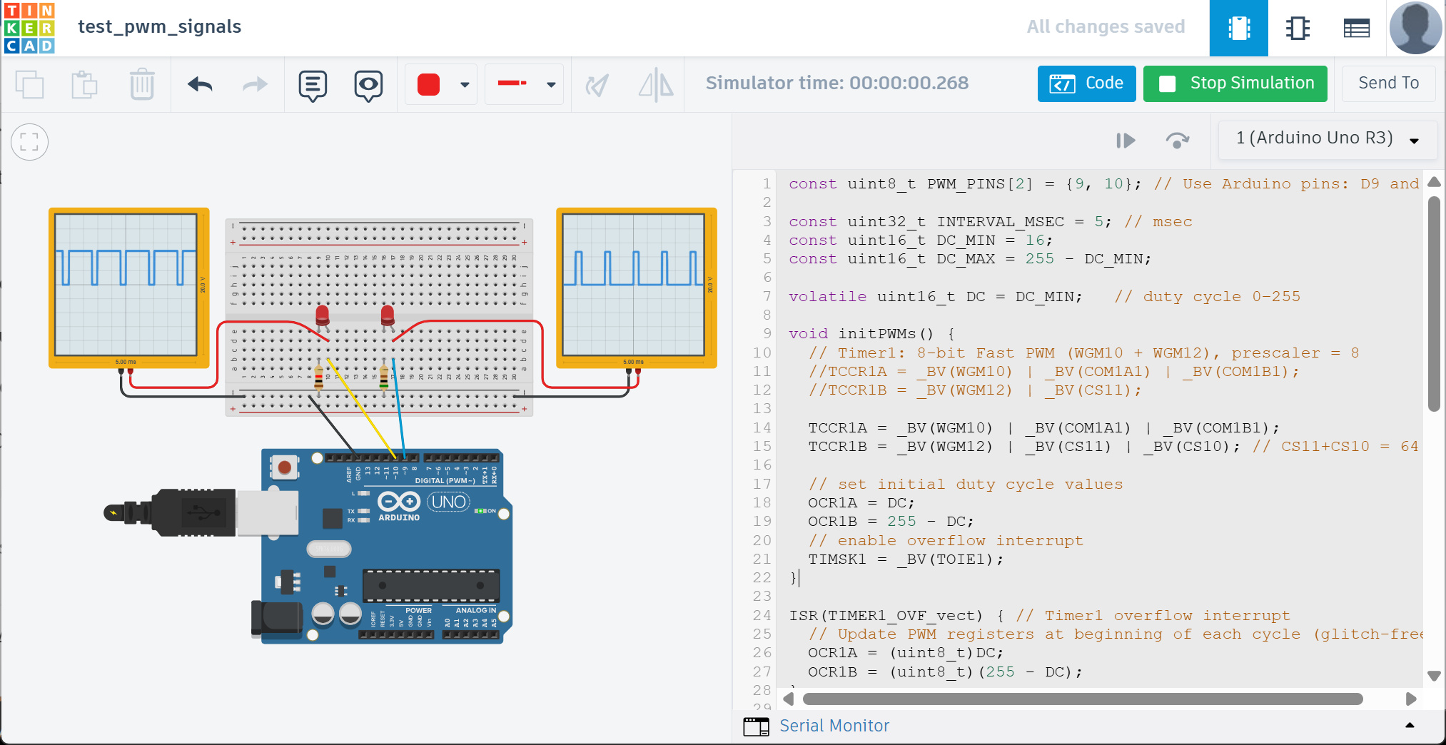 ตัวอย่างโค้ดนี้สาธิตการเปิดใช้งานวงจร Timer 1 ภายในชิป ATmega328P ที่มีอยู่บนบอร์ด Arduino Uno หรือ Arduino Nano โดยสัญญาณเอาต์พุตที่ได้มีจำนวน 2 ช่องสัญญาณ (เลือกใช้ขา Arduino D9 และ D10) และเป็นสัญญาณแบบ PWM ทั้งสองช่องมีความถี่เท่ากัน แต่มีค่า Duty Cycle แตกต่างกัน