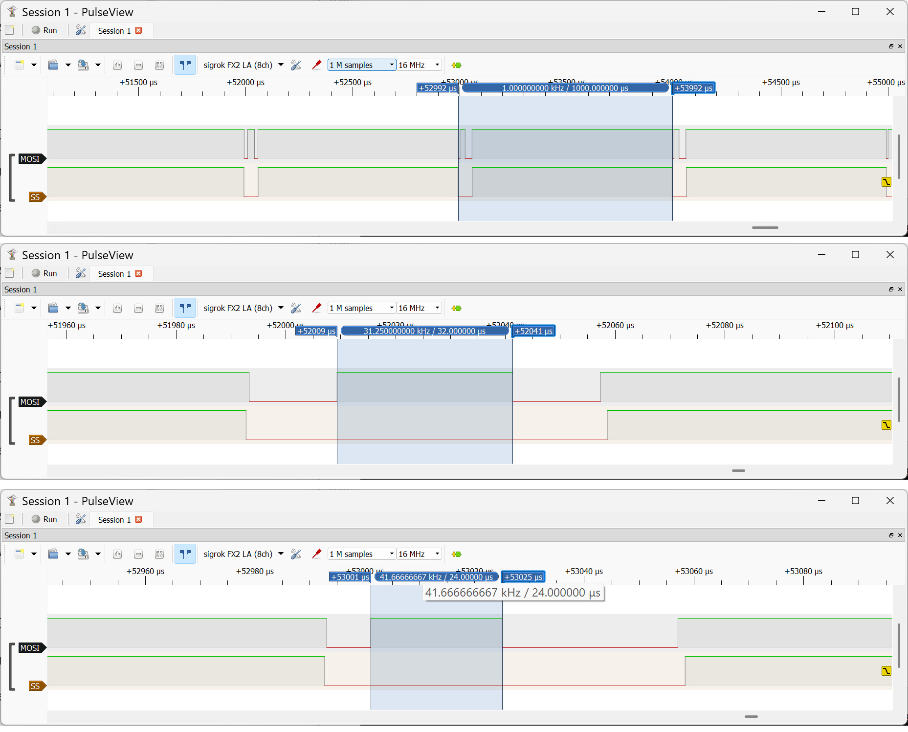 - ใช้ Oscilloscope ตรวจวัดสัญญาณดิจิทัลสำหรับบัส SPI: เช่น สัญญาณ /SS, MOSI, SCK
