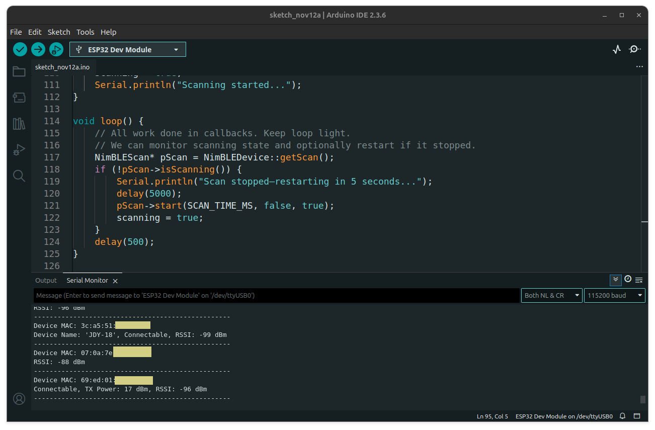 * BLE scanner using NimBLE-Arduino v2.3.6