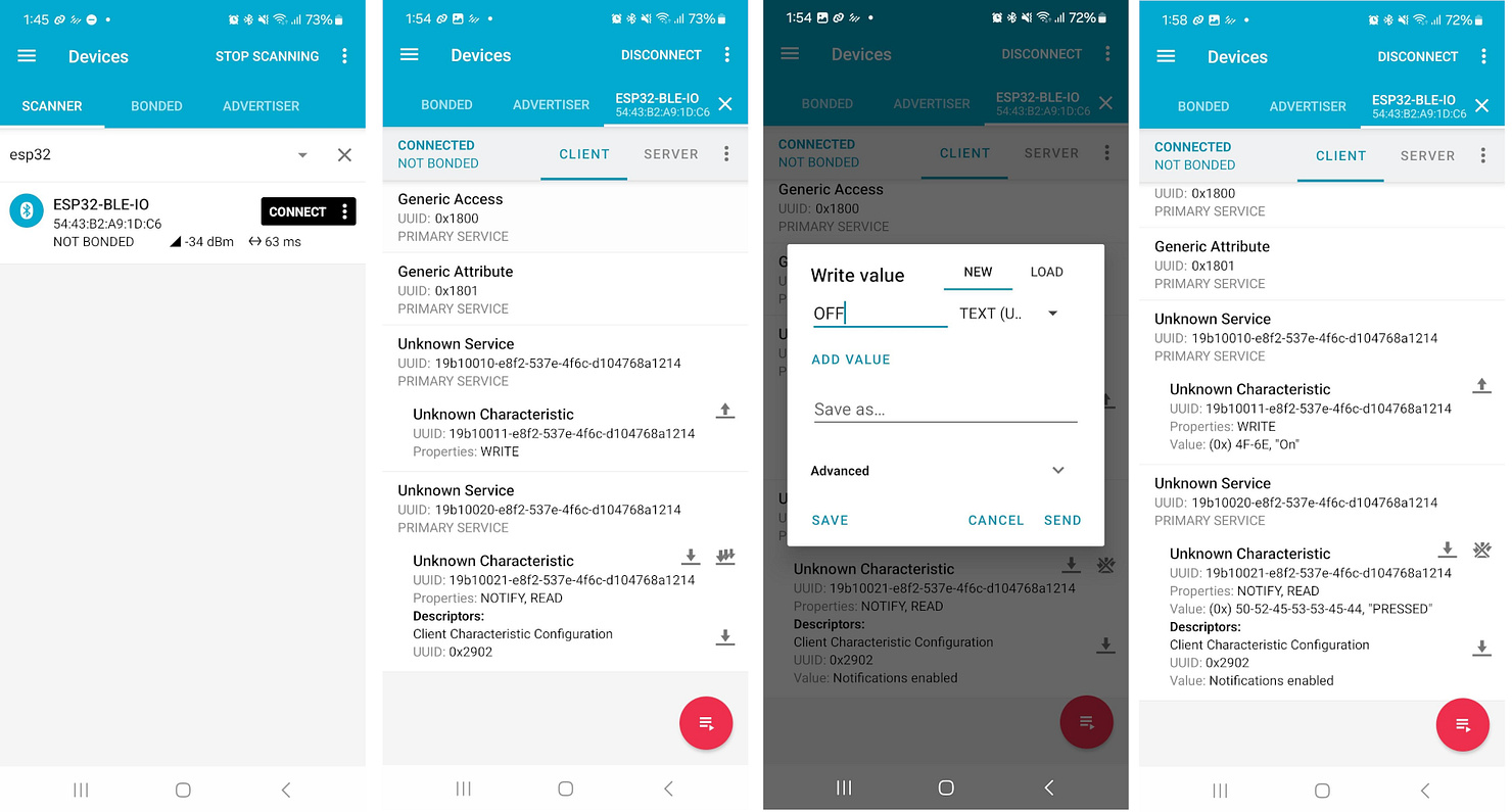 "ESP32-BLE-IO" - เมื่อเลือกอุปกรณ์แล้ว จะเชื่อมต่อไปยัง GATT Server ที่ให้บริการโดย ESP32