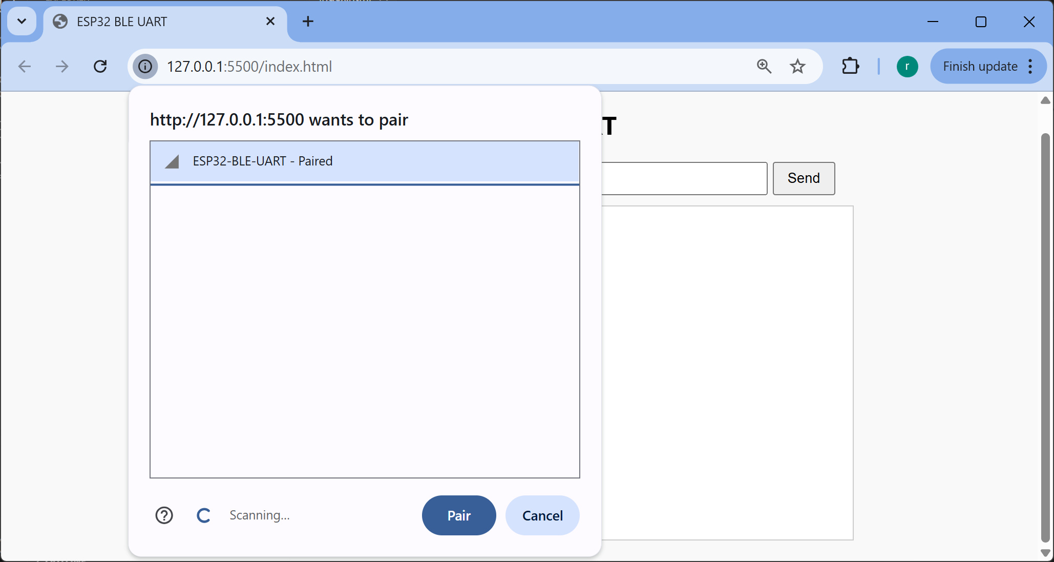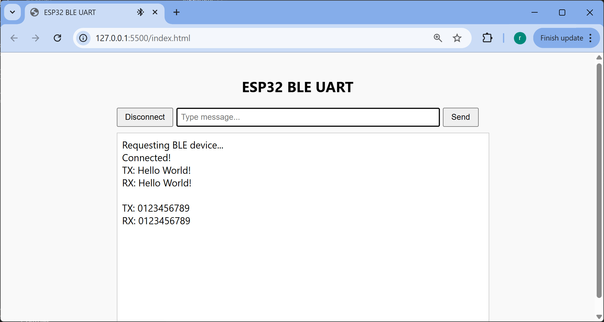 รูป: การทดสอบพิมพ์ข้อความจาก Chrome เพื่อส่งไปยังบอร์ด ESP32 โดยใช้บริการ BLE-UART