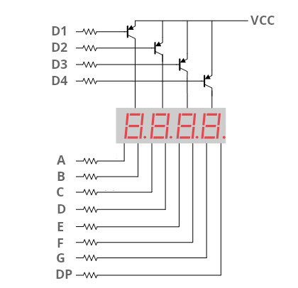 Figure: 4-digit 7-segment display (CA type) with PNP BJTs as digit control transistors