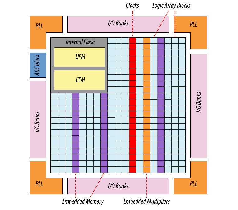 - The central grid consists of Logic Array Blocks (LABs), each containing logic elements such as 4-input LUTs, flip-flops, and associated control logic. These LABs are arranged in vertical columns across the chip.