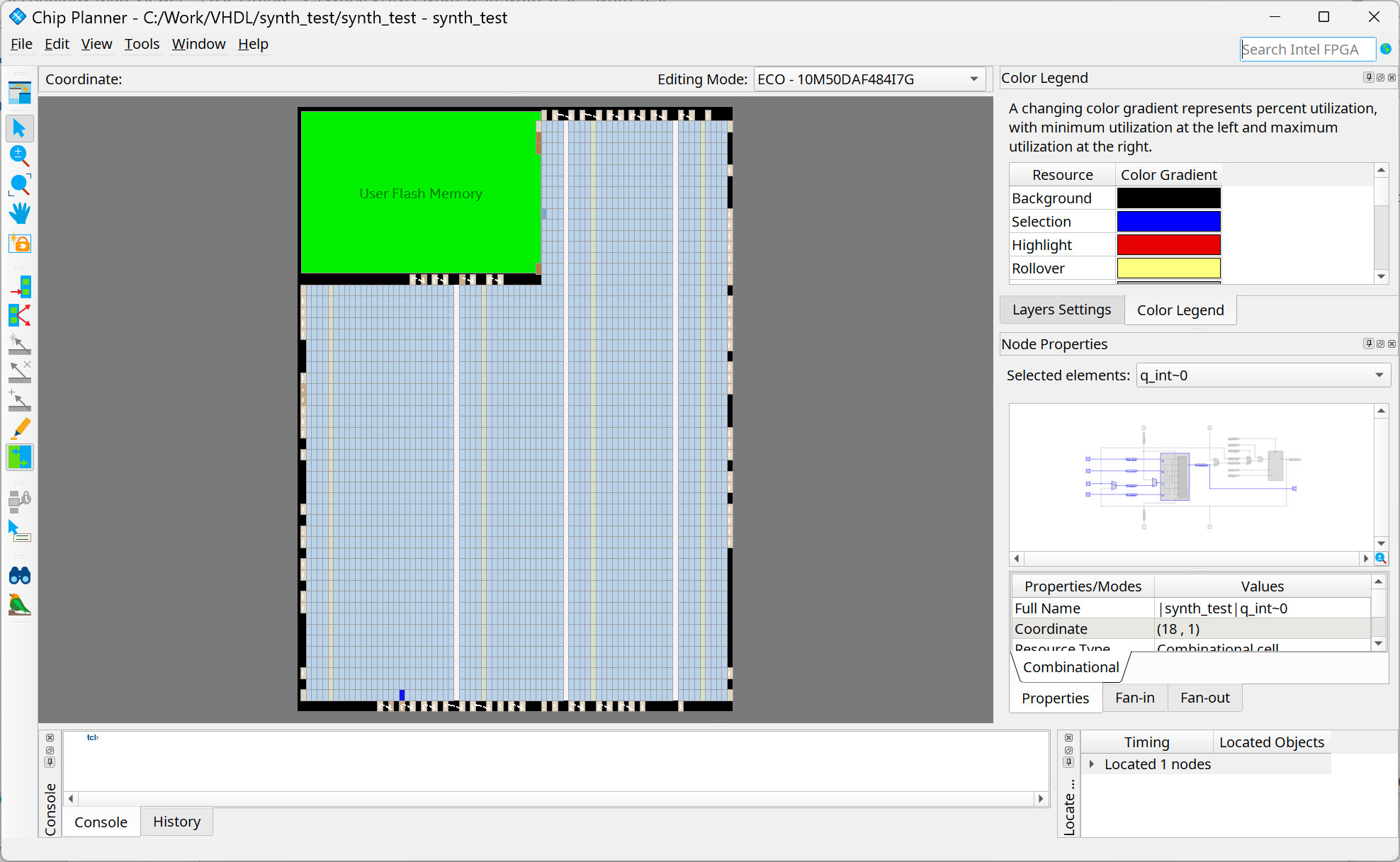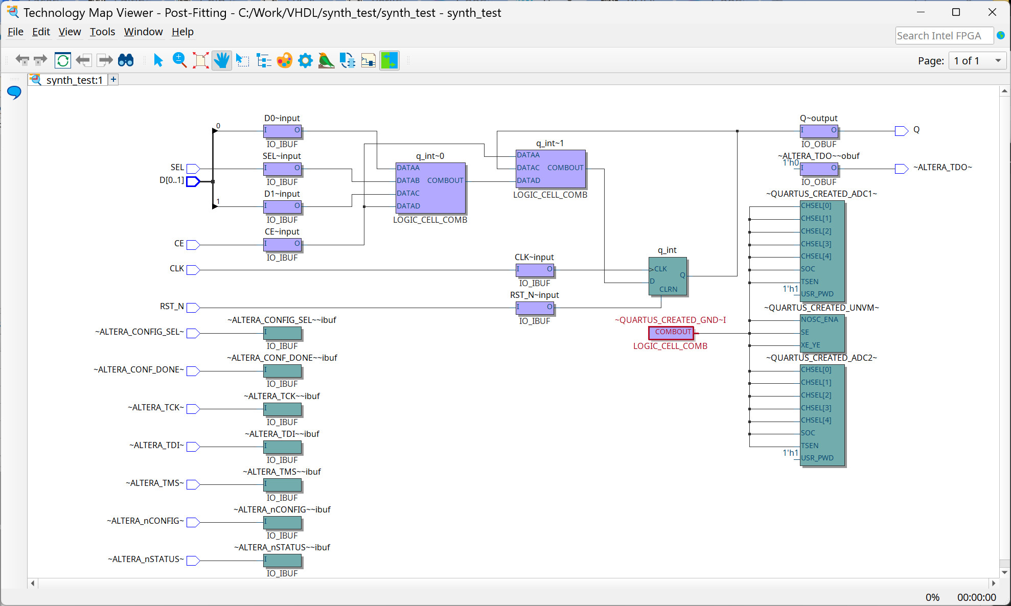 - The Post-Fitting Viewer shows the final physical implementation of the design after placement and routing. It displays how the logic elements, interconnects, and I/O blocks are physically placed within the FPGA fabric.