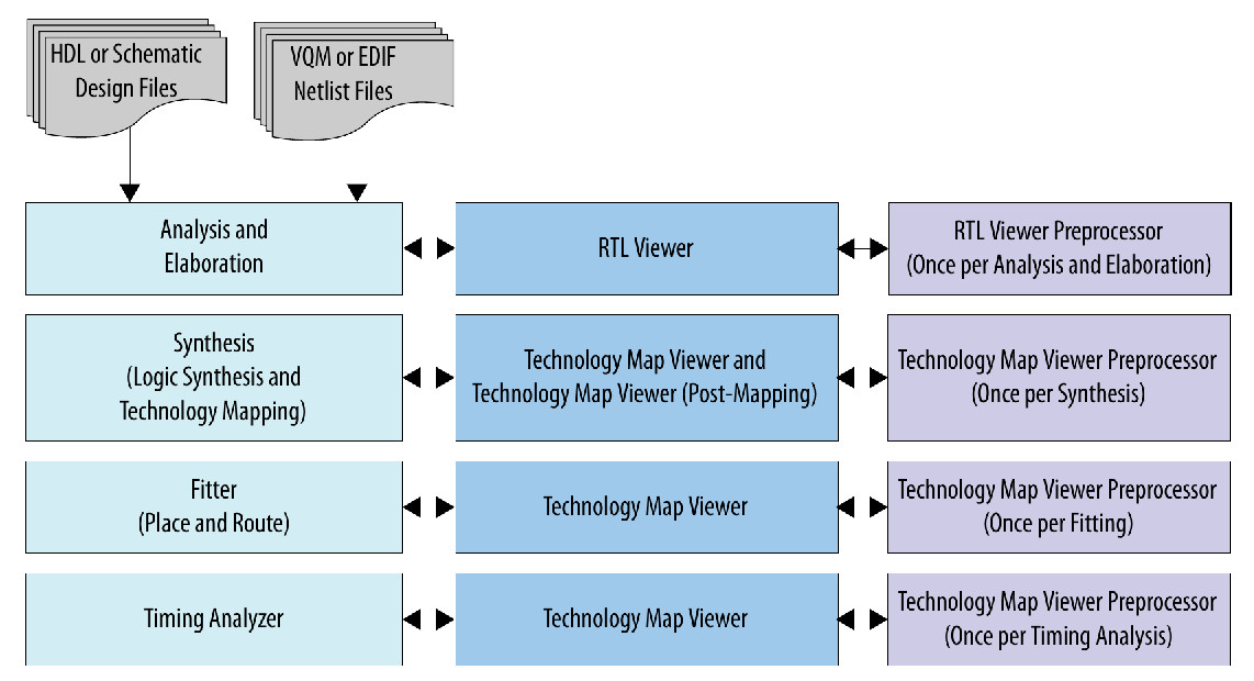 The result of the design compilation can be visualized using the RTL Viewer, the Post-Mapping Viewer and the Post-Fitting Viewer.