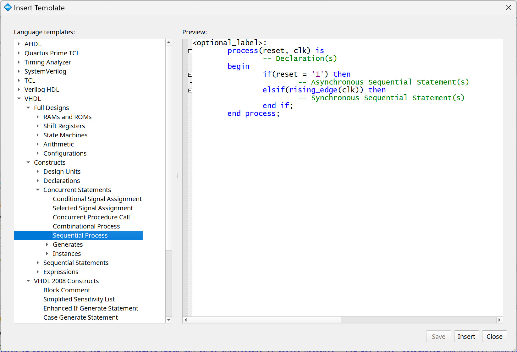 Quartus Prime offers a collection of helpful HDL Code Templates (for VHDL, Verilog, and SystemVerilog), which can assist in accelerating development and ensuring best practices.