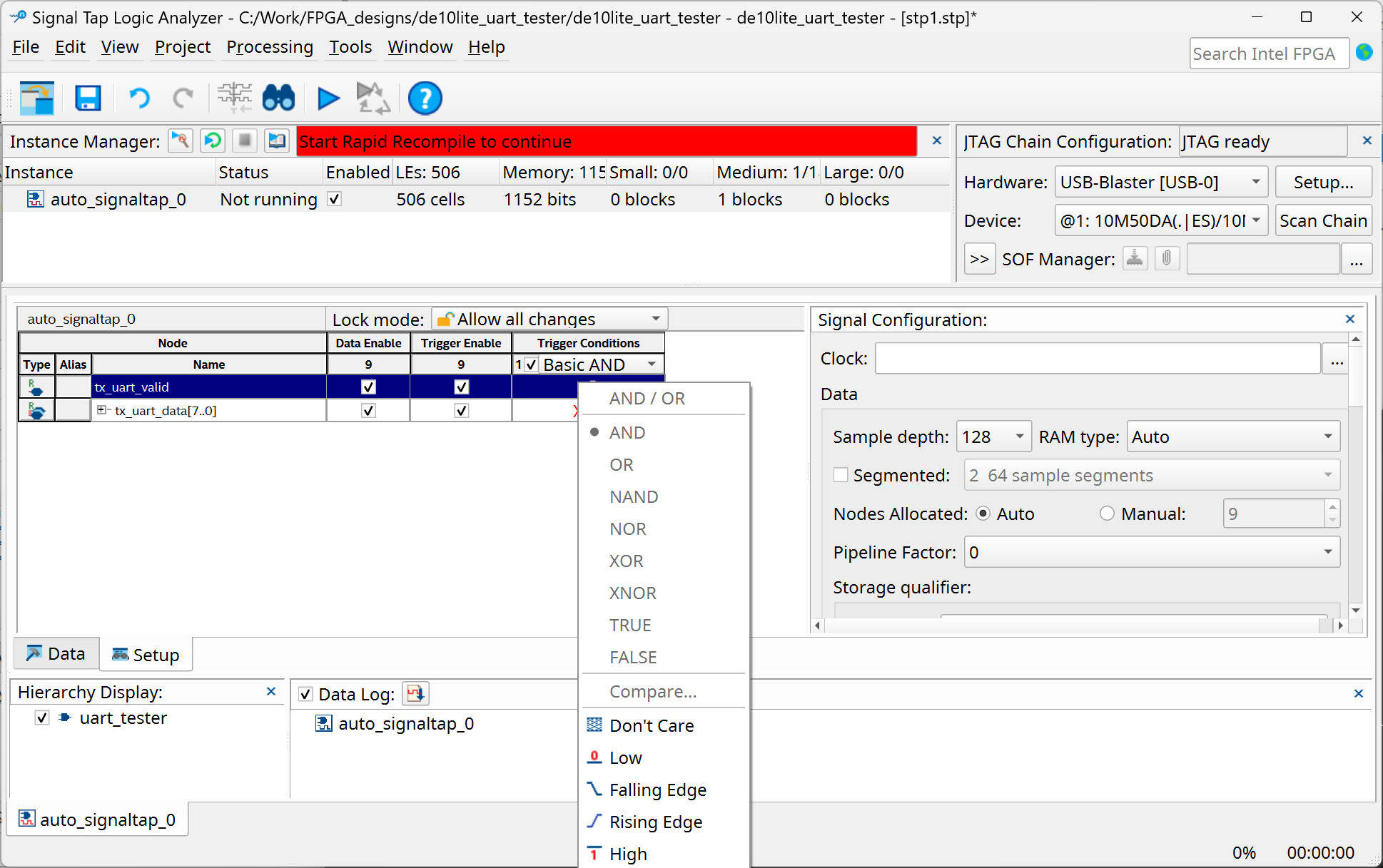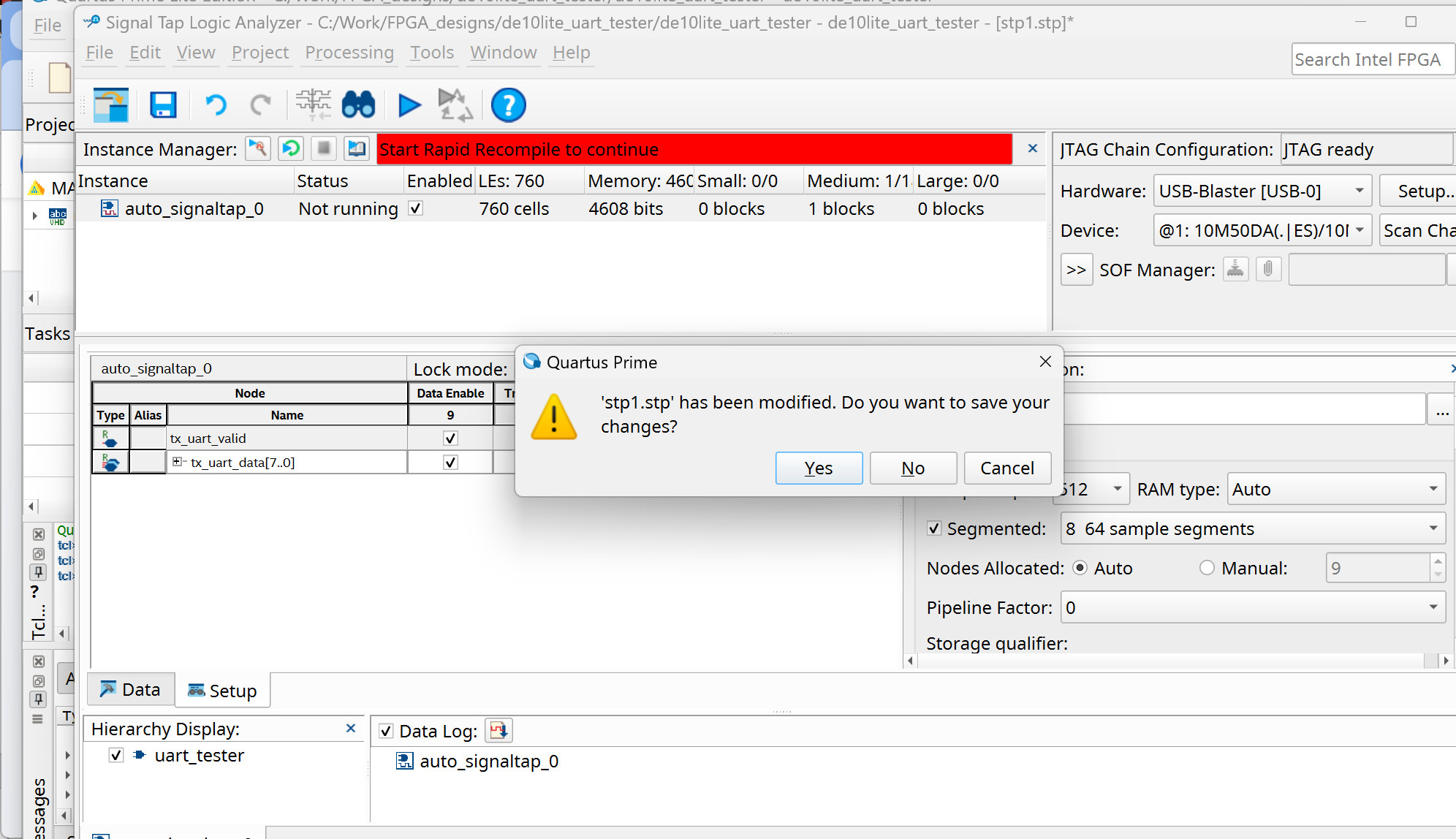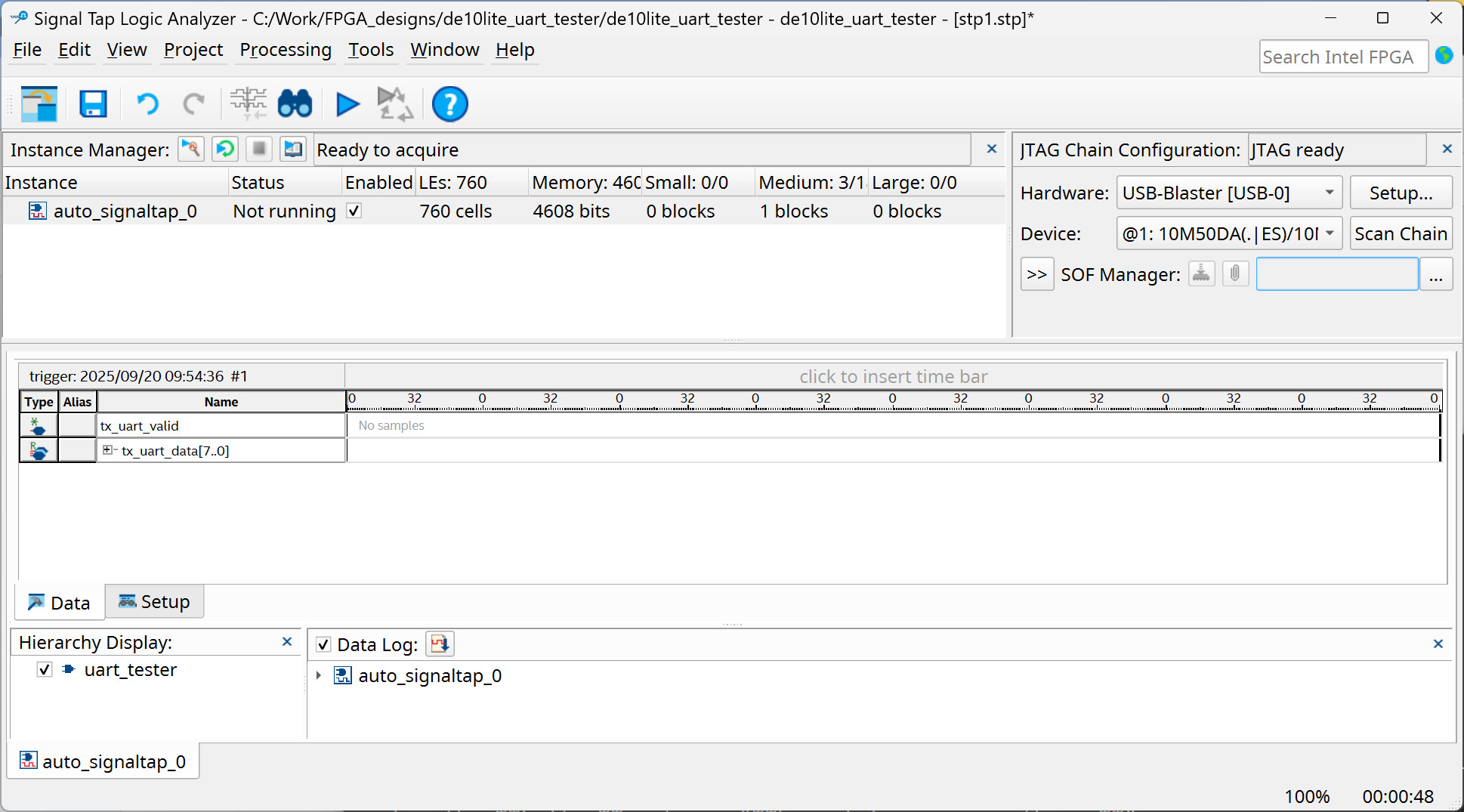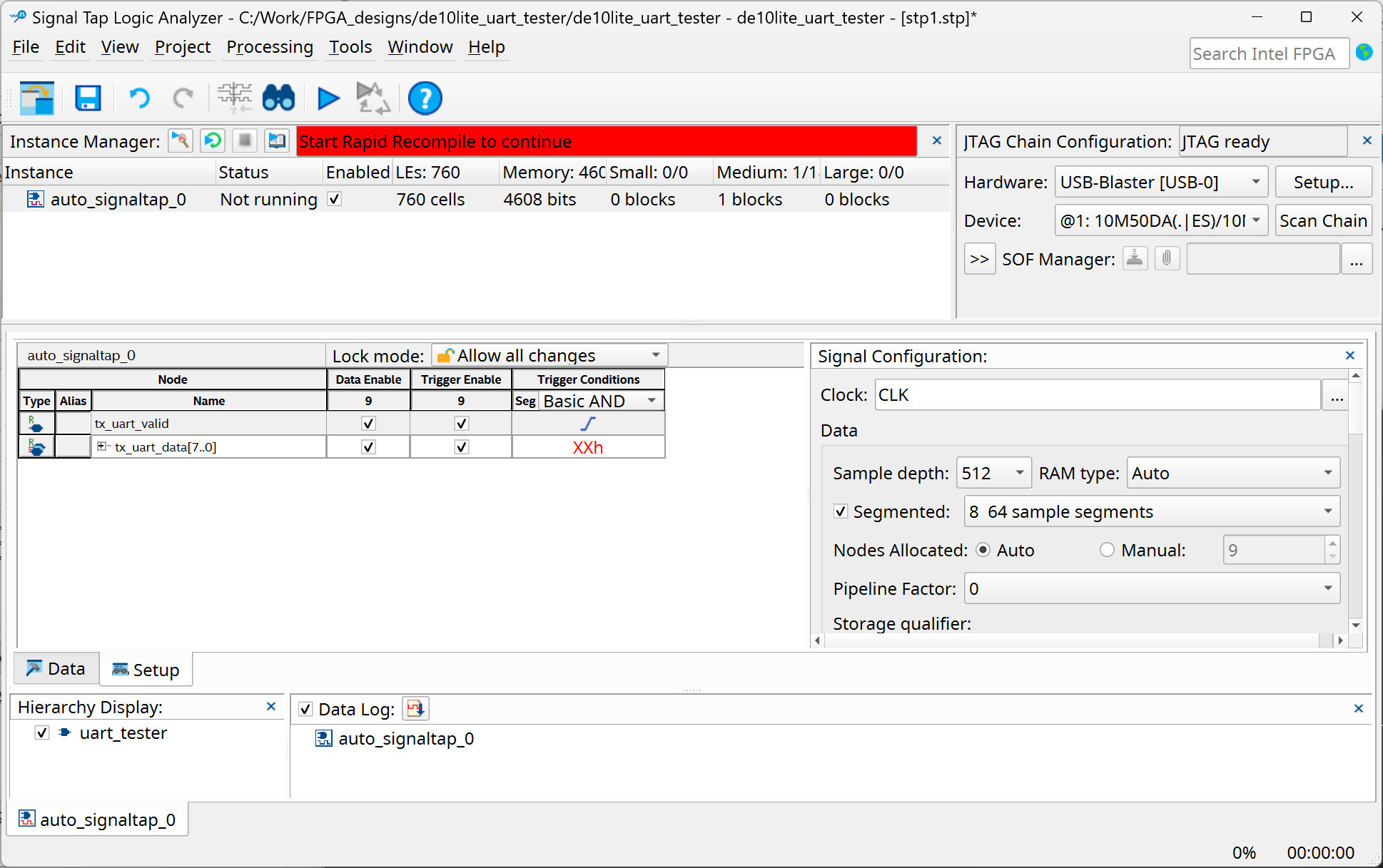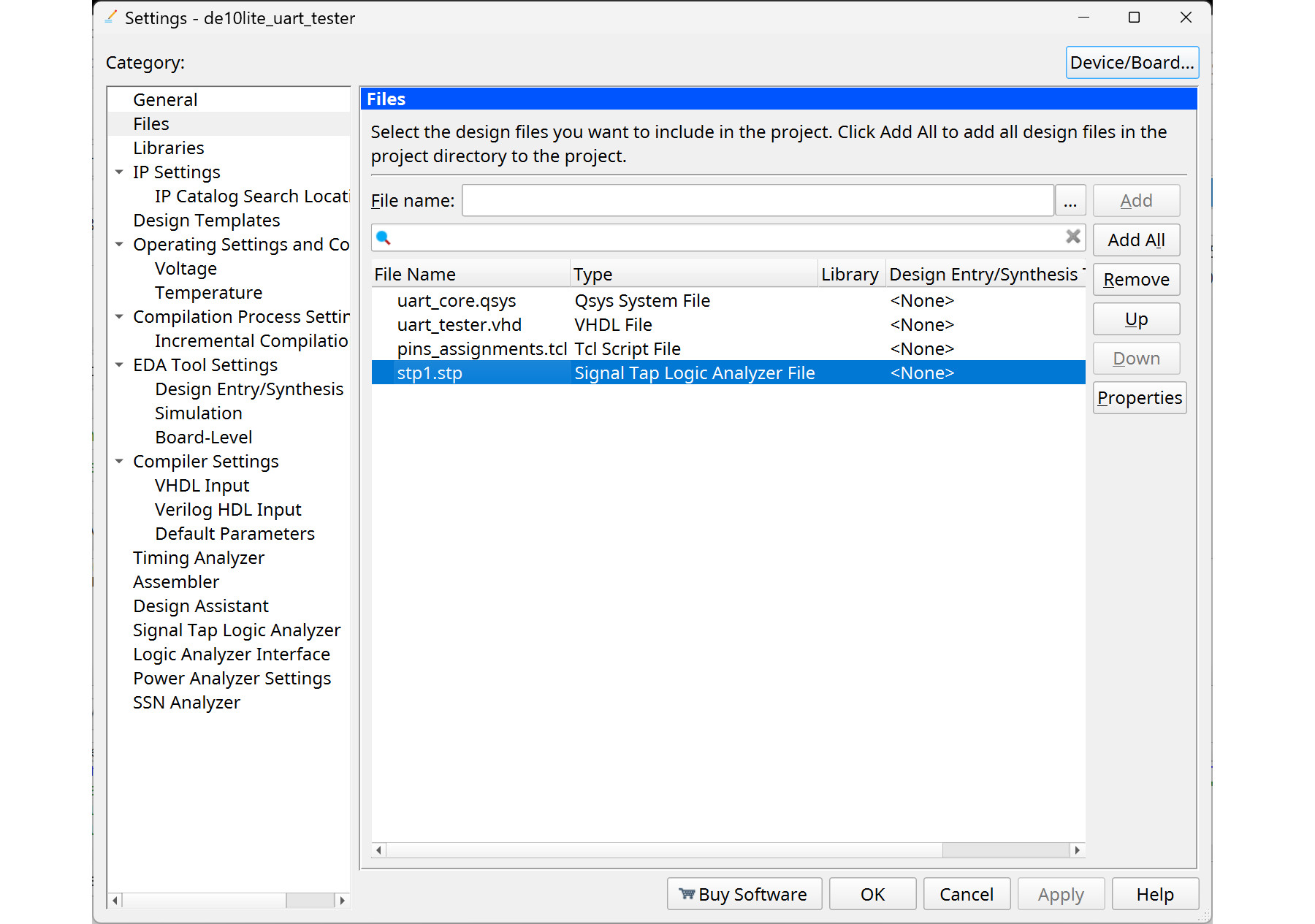.stpfile. This file will be added to the design project. - Recompile the project (full compilation) and upload the bitstream to the FPGA board.