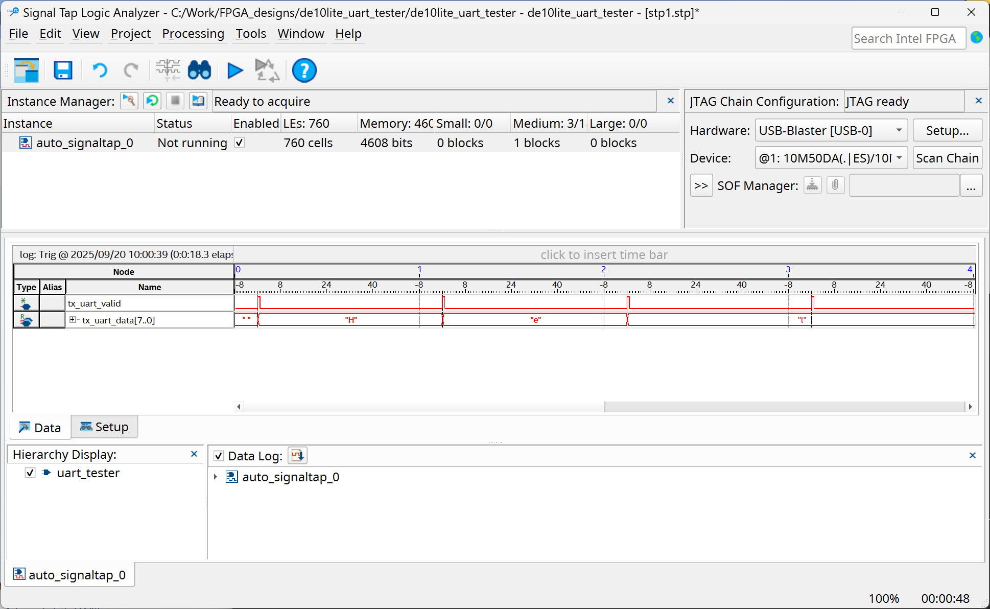 - If the Signal Tap LA is "ready to acquire", click "Run Analysis" and observe the waveforms in the Data tab.