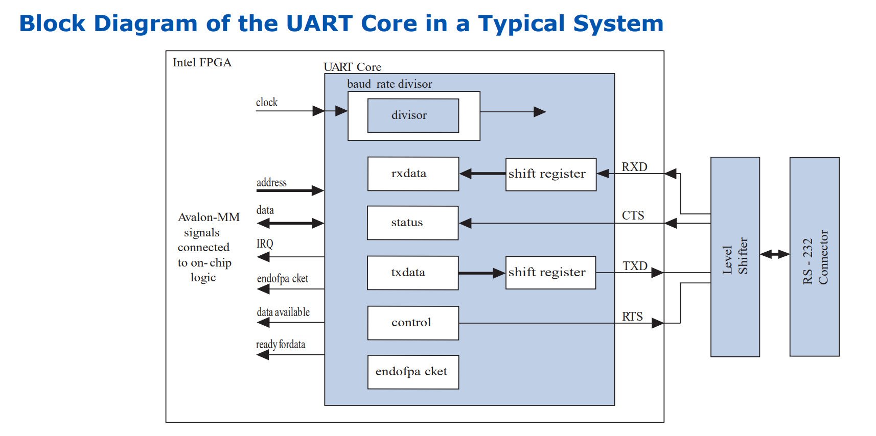 Figure: A typical block diagram of Intel UART core with Avalon bus interface (Source: Intel/Altera)