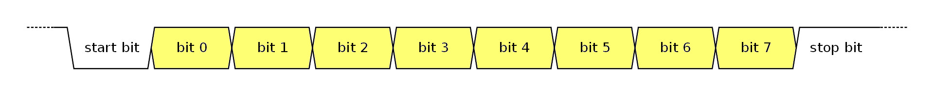 The UART hardware transmits each character framed with a logic-low start bit, an arbitrary number of data bits (typically 8 bits), an optional parity bit, and one or more stop bits. In most UART implementations, the least significant bit (LSB) is transmitted first.