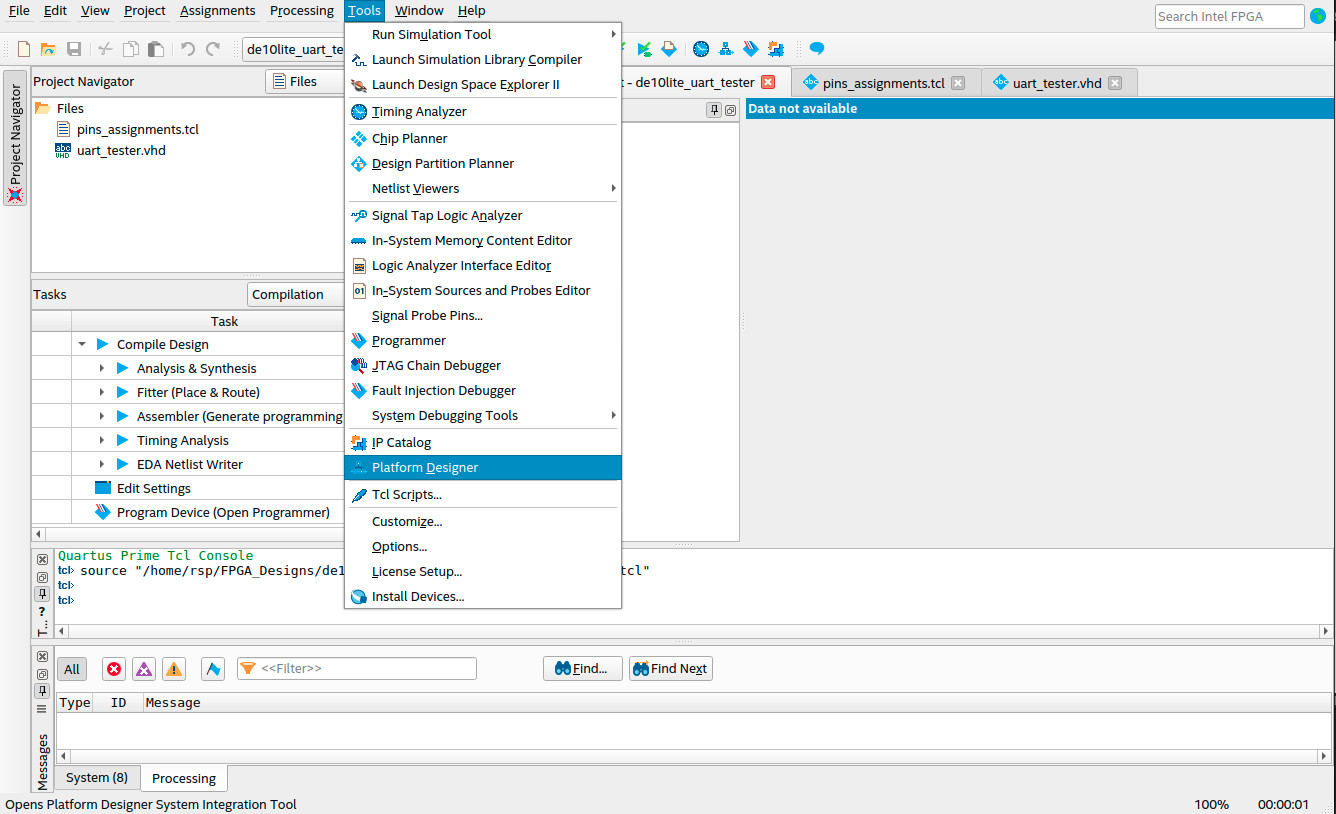 - Open Quartus Prime, create a new FPGA project using the New Project Wizard, then go to the menu "Tools > Platform Designer" to start the Platform Designer tool.