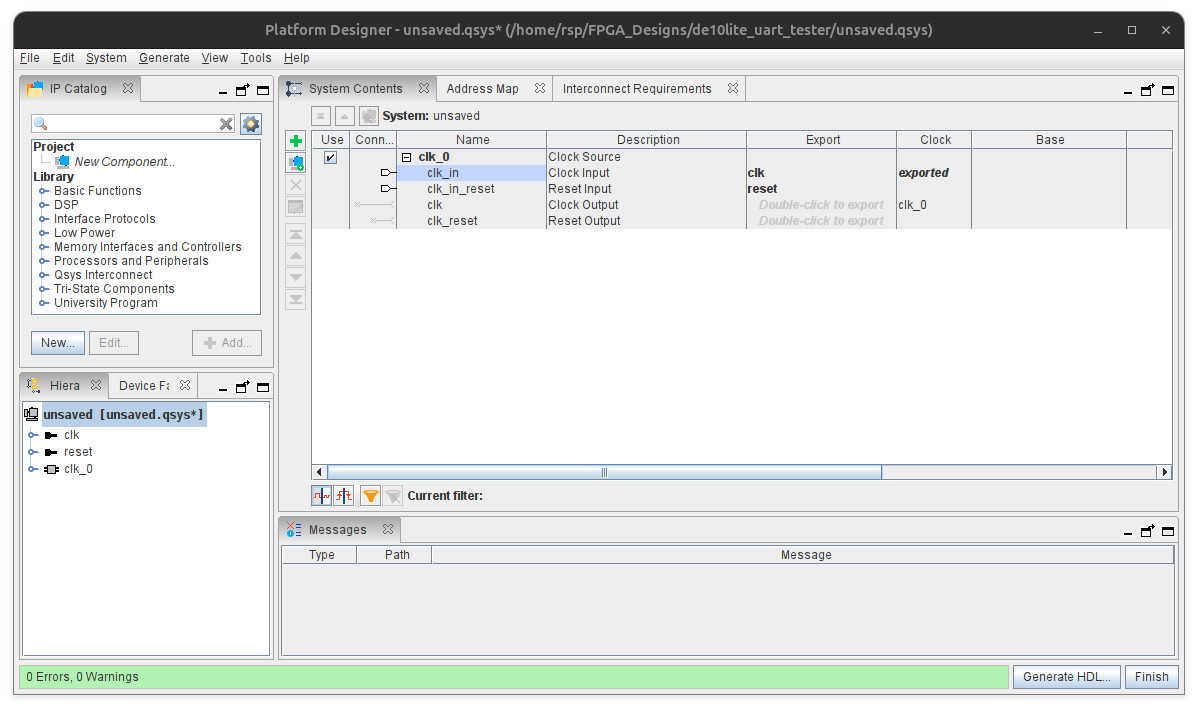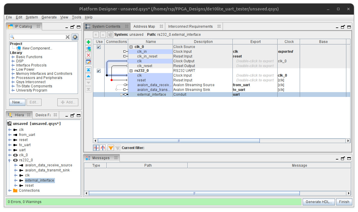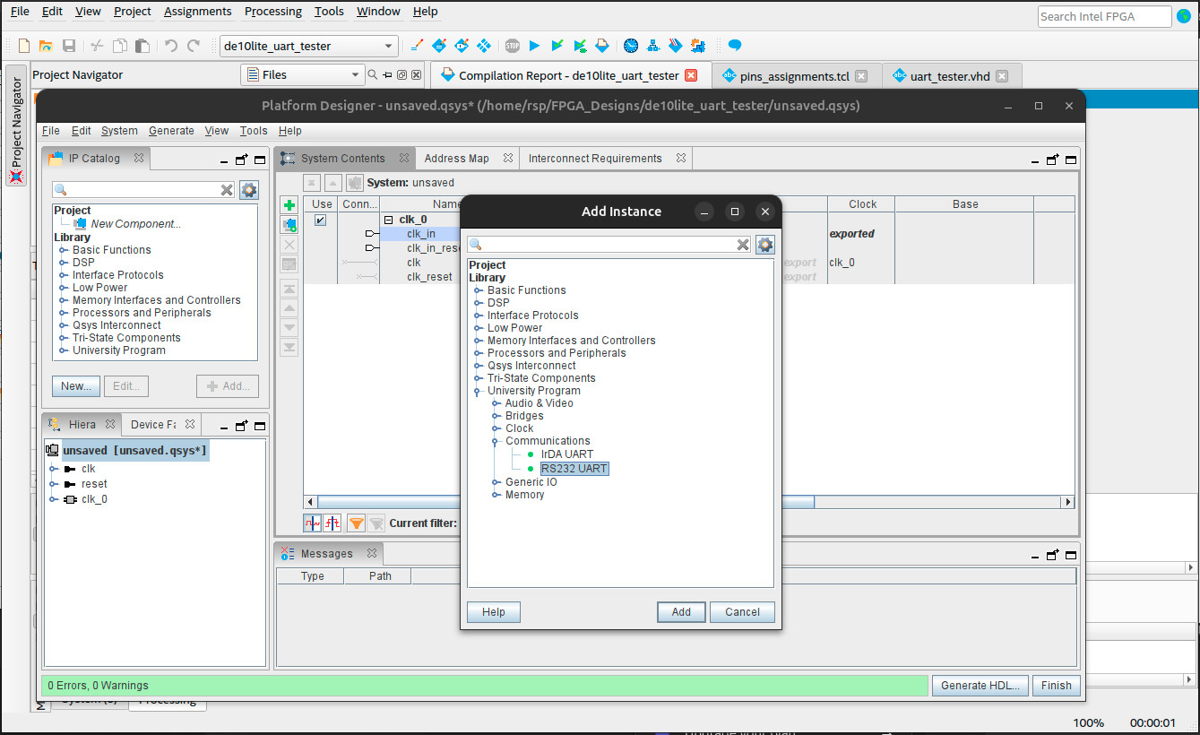 .qsysto the project. - Instantiate the RS232 UART IP core in your top-level design.