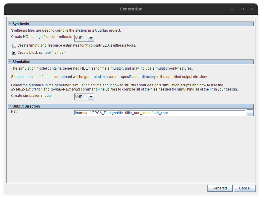 - Click the "Generate HDL" button to generate code for the IP core. Choose VHDL as the output type and specify the output directory for the IP core files.
