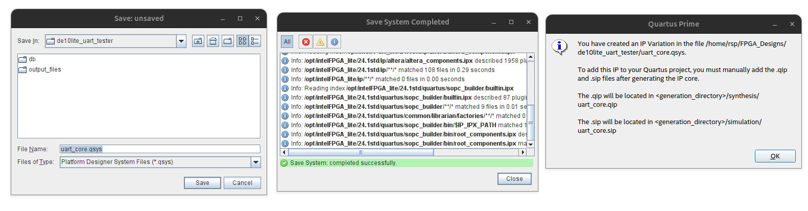 Note that for serial data communication, Quartus Prime software provides some UART IP cores such as RS232-UART Core (Intel FPGA IP for Intel DE-Series Boards), Intel FPGA 16550 Compatible UART Core, UART Core, Lightweight UART Core and JTAG-UART Core.