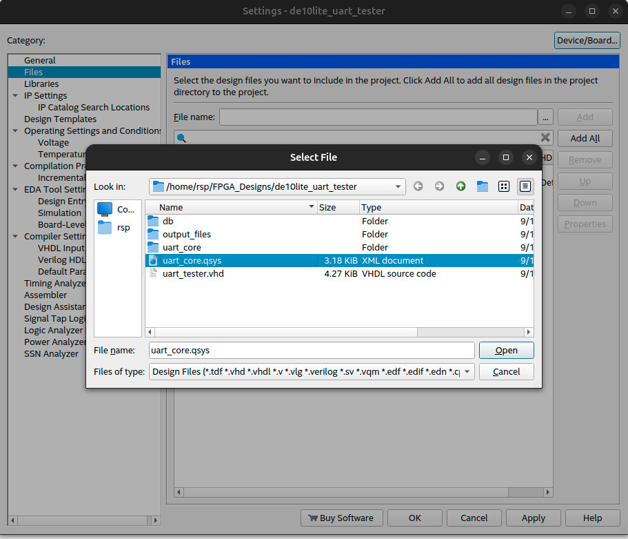 Figure: Adding the Platform Designer System file (.qsys) to the project