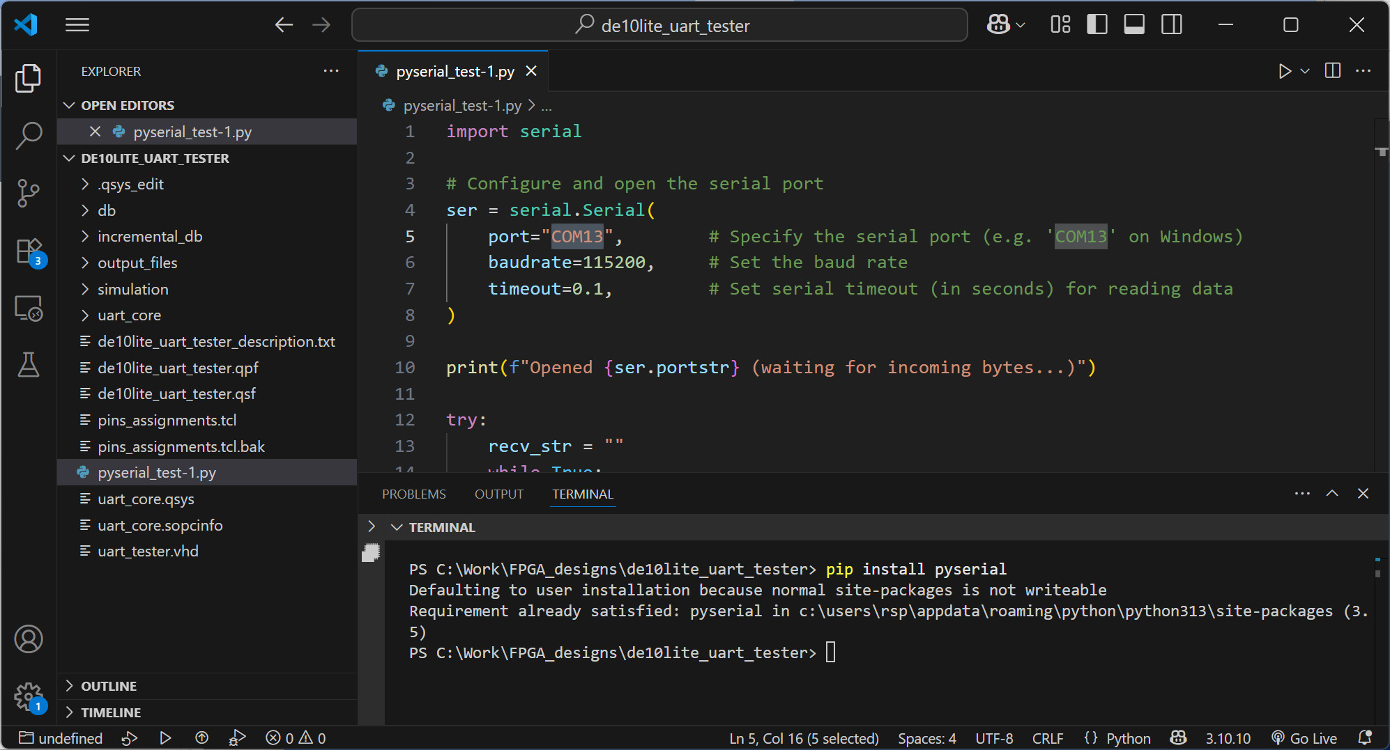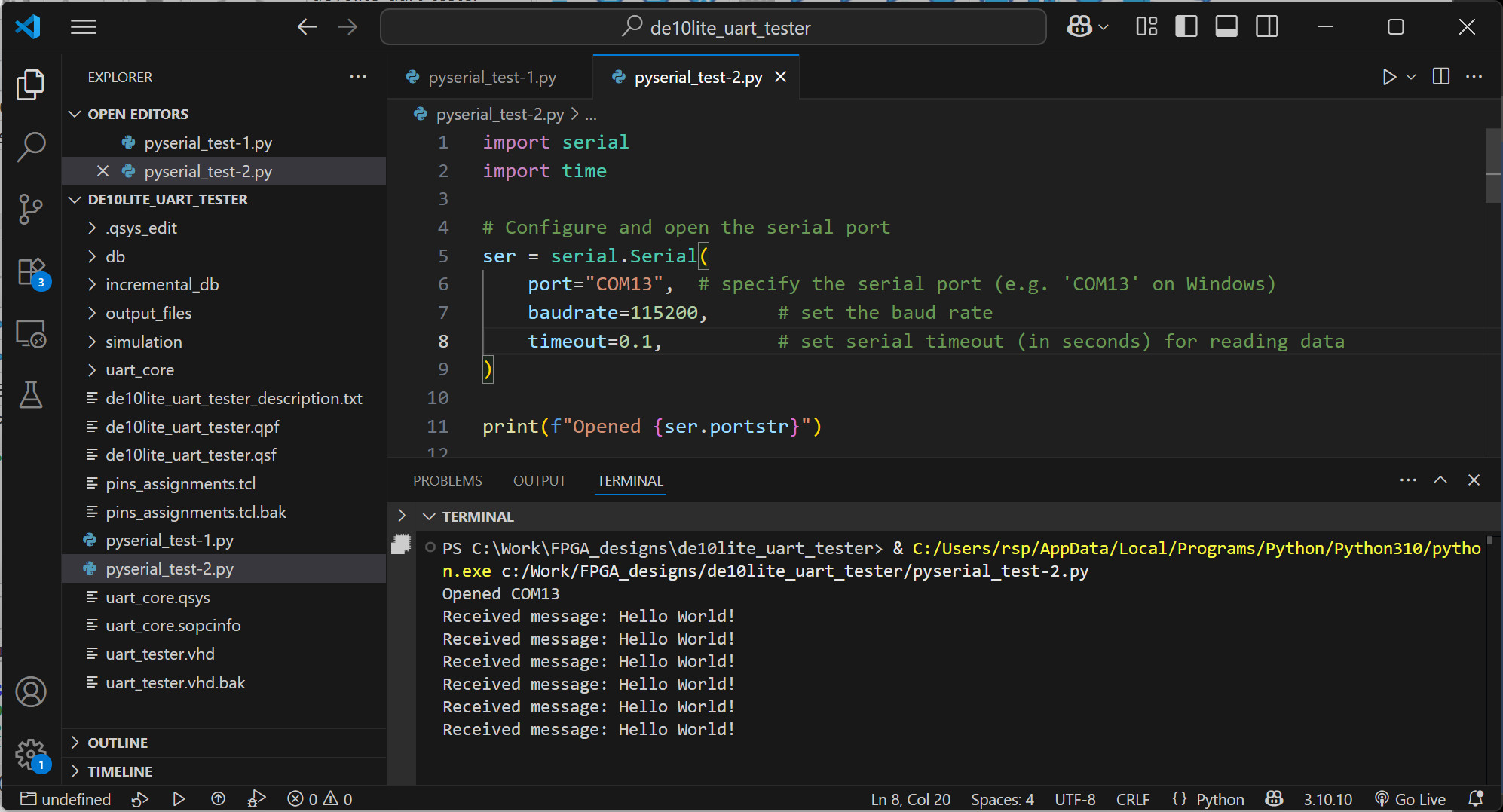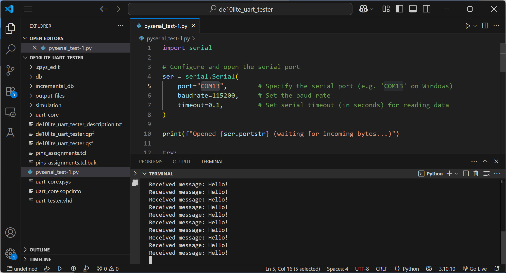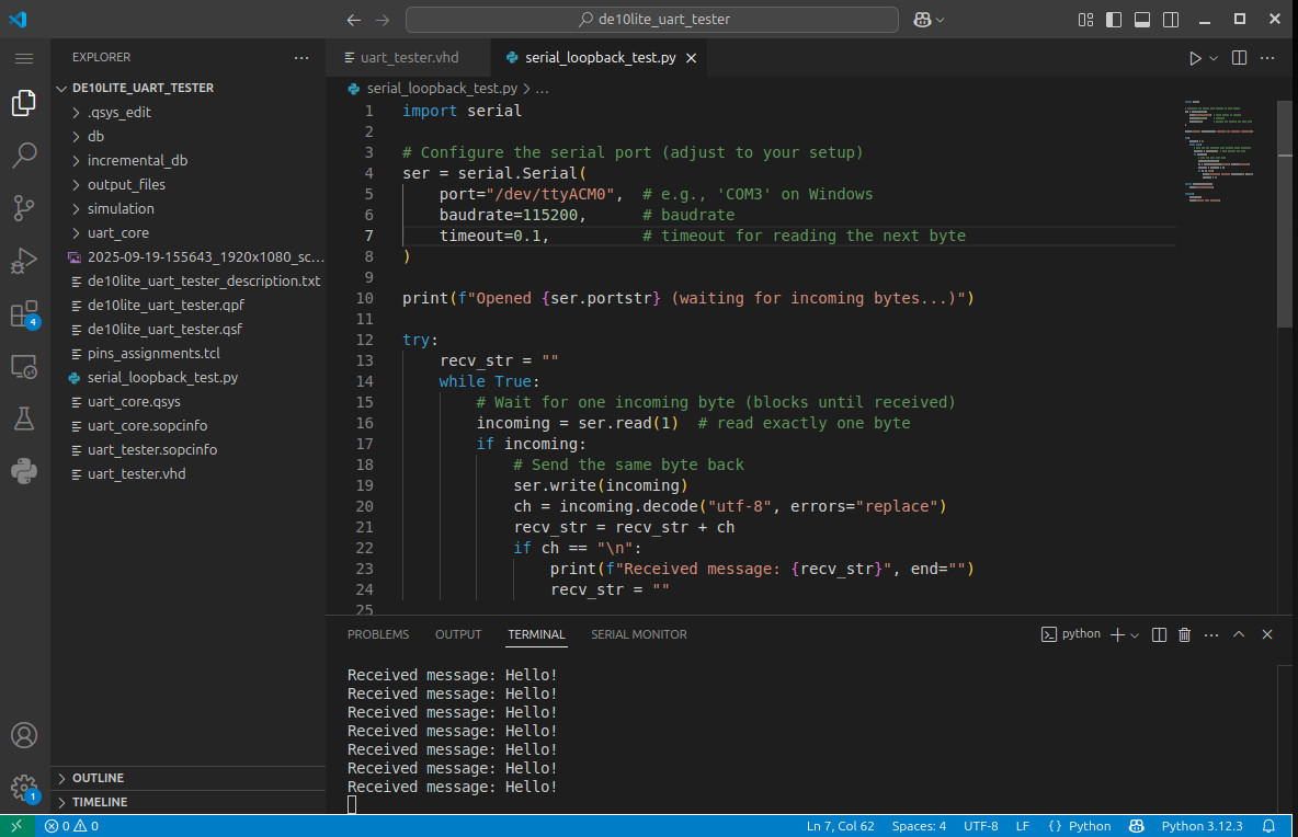 Figure: Running the Python script in VS Code IDE (Windows 11) for serial-loopback test