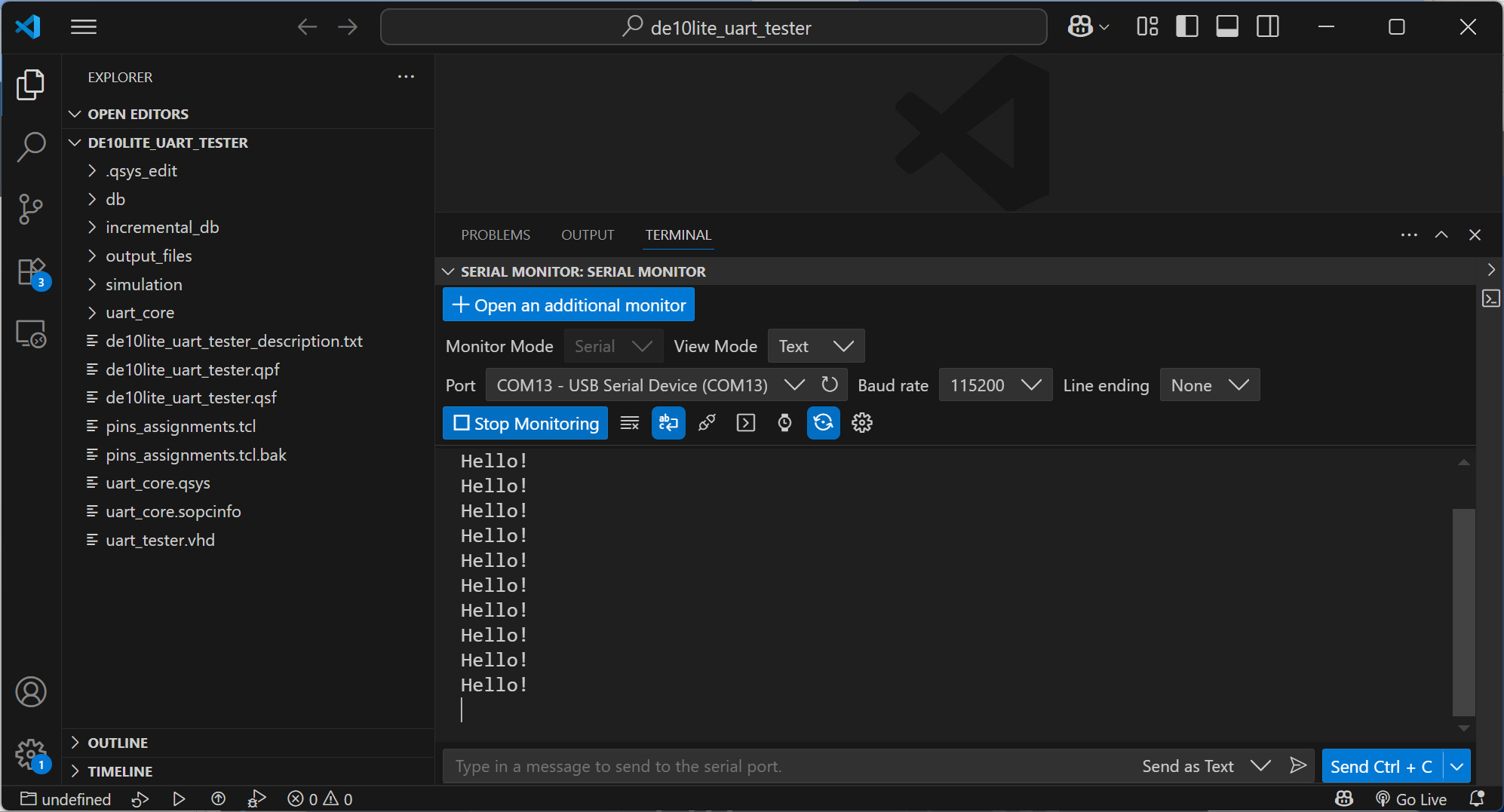 In this example, we revise the previous VHDL code to operate in serial loopback mode. The FPGA waits for an incoming byte from the host computer (Python) via the UART and sends the received byte back to the UART.
