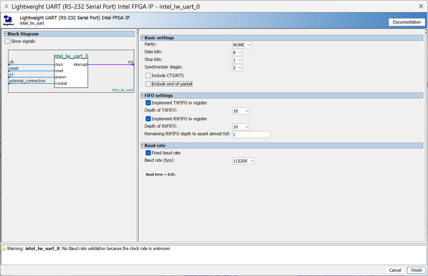 Figure: UART IP core settings