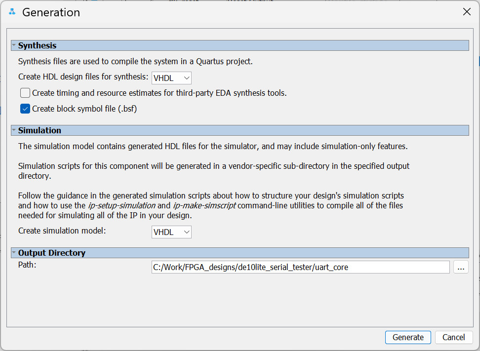 - Click the "Generate HDL" button to generate code for the IP core. Choose VHDL as the output type and specify the output directory for the IP core files.