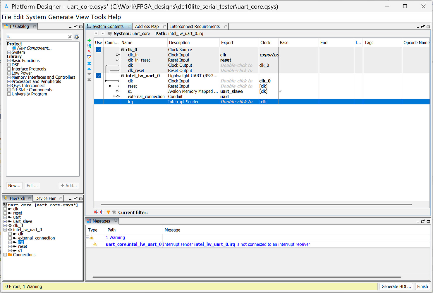 .qsys). After generating the IP core, add the.qsysto the project. - Instantiate the Lightweight UART core in your top-level design.