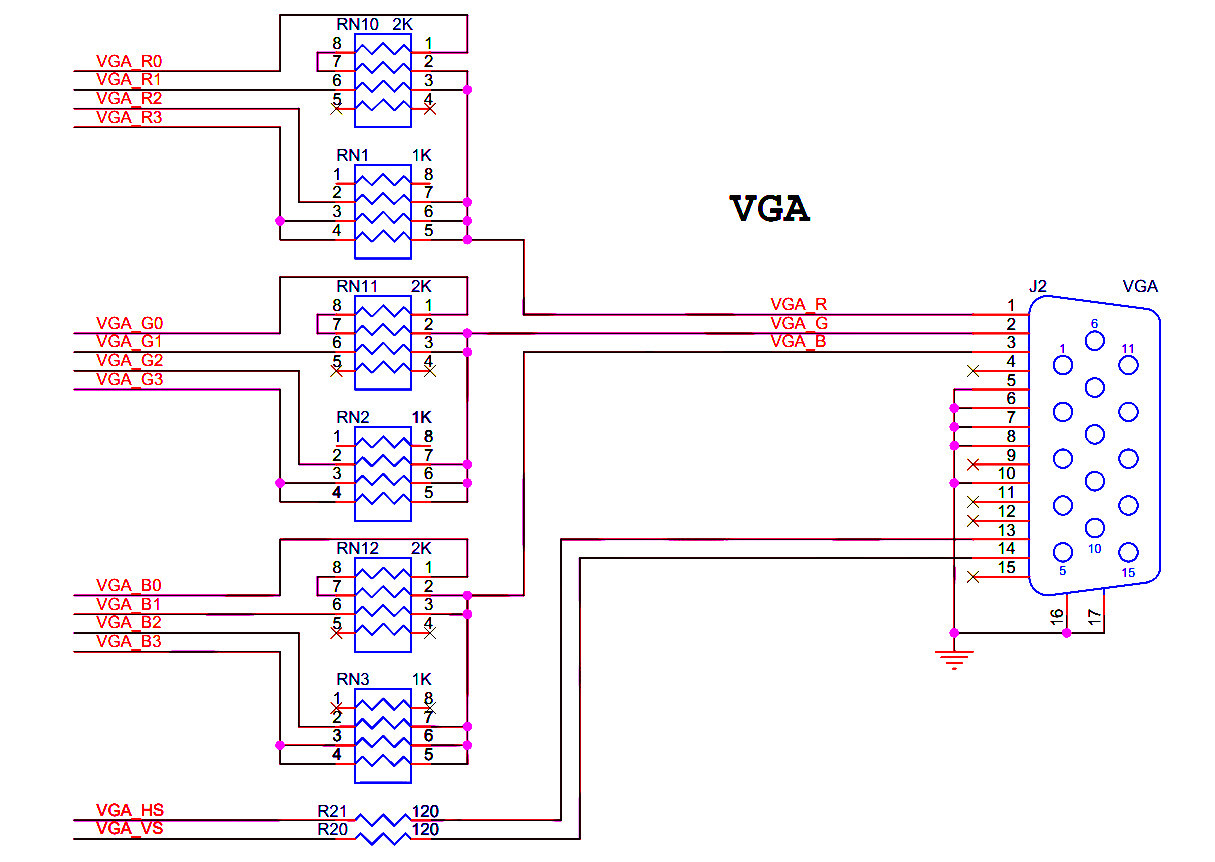 From the circuit diagram, it can be seen that there is a D-Sub (15-pin) connector for VGA. In addition, an R-2R resistor ladder DAC is used to convert a 4-bit digital signal into an analog signal for each color channel (R, G, B).