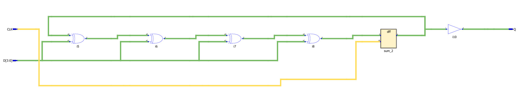 Figure: Schematic of the synthesized logic circuit (XOR-based parity bit generator with a registered output)