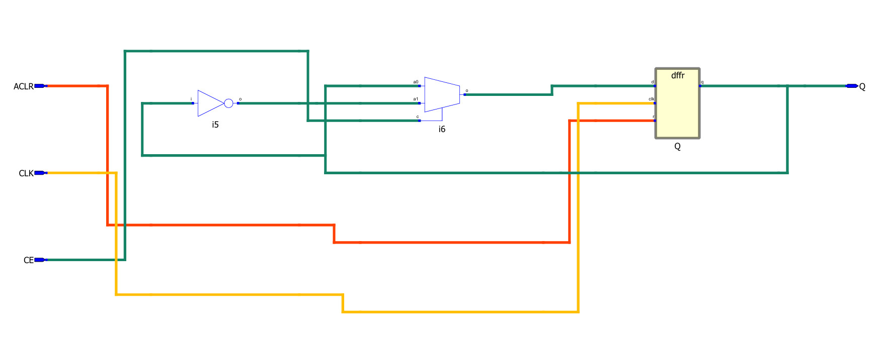Figure: Schematic of the synthesized logic circuit (a toggle flop-flop)