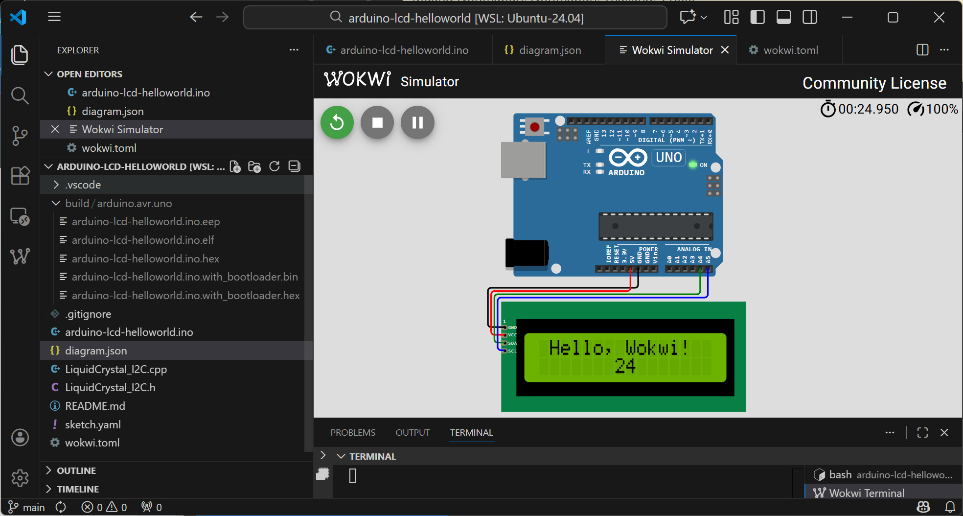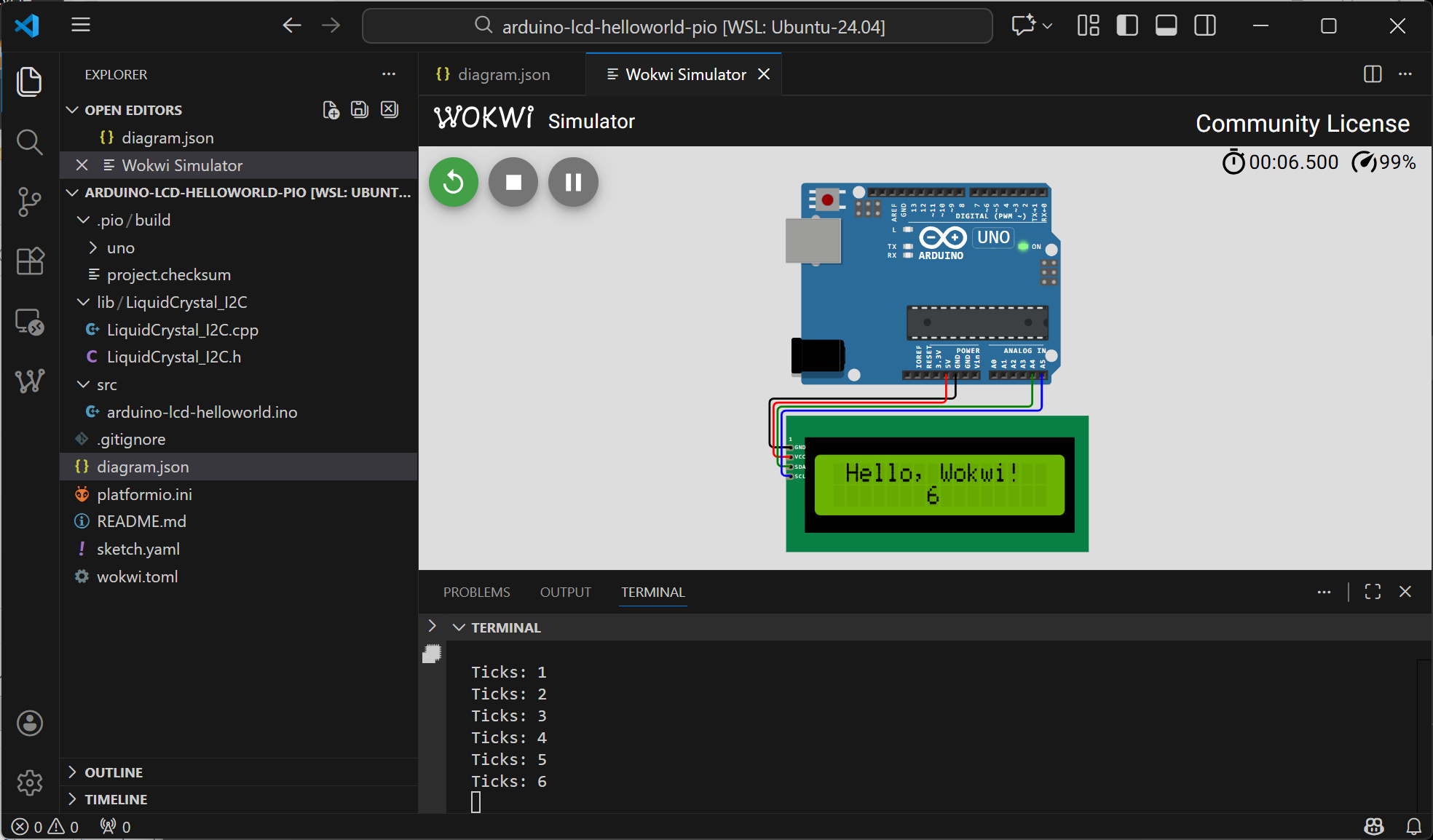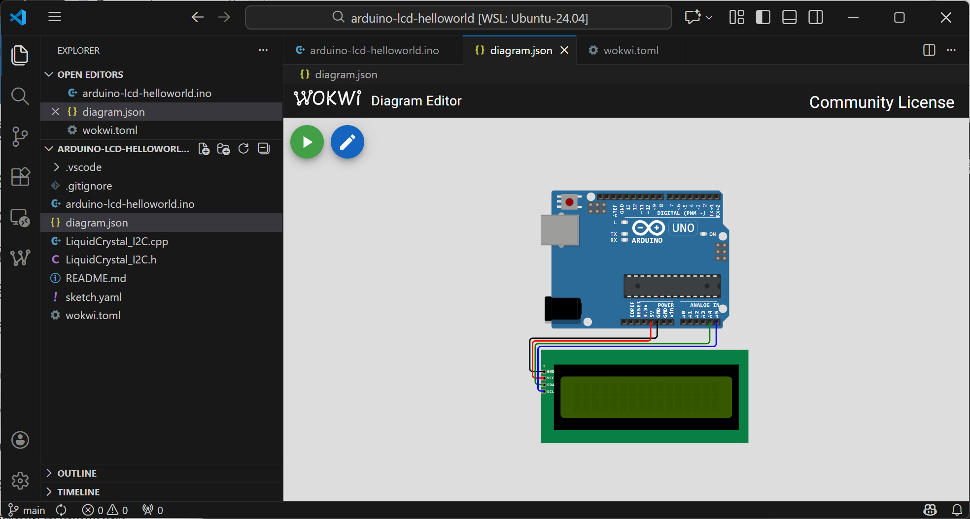 รูป: ตัวอย่างโปรเจกต์ arduino-lcd-helloworld และเปิดดูไฟล์ diagram.json