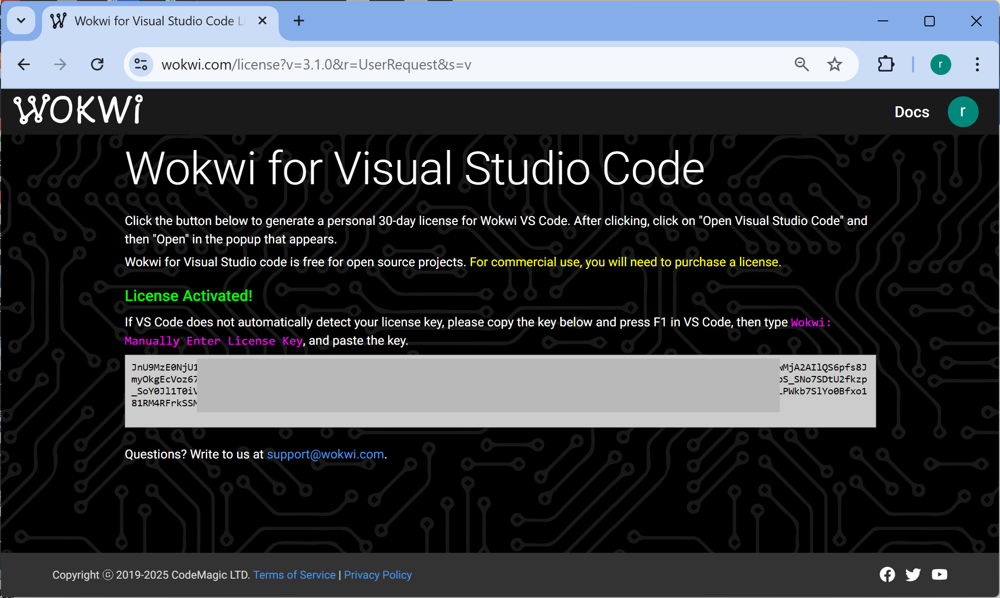 - ไปยังหน้าเว็บ Wokwi License สมัครเข้าใช้งาน และขอ Wokwi License Key (one-year license) ได้ฟรี เพื่อนำมาใช้กับ Wokwi Simulator ใน VS Code IDE