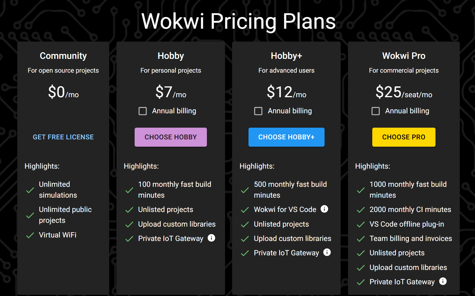 Wokwi เปิดบริการให้ใช้งาน มีทั้งแบบฟรี และแบบมีค่าใช้จ่ายรายเดือน จำแนกได้ดังนี้